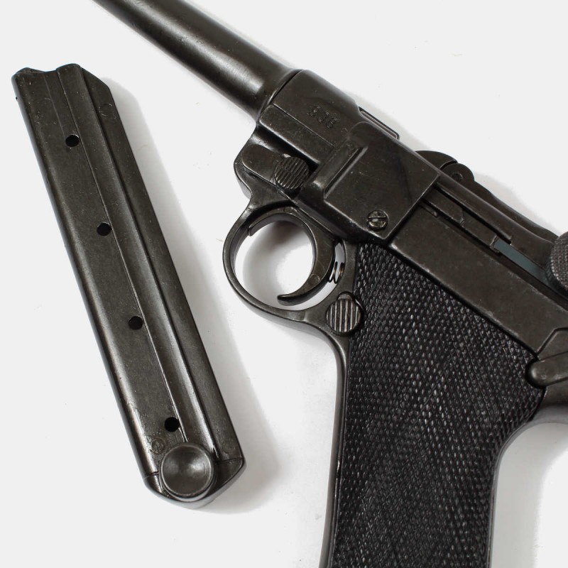 This reproduction of the famous German Luger P-08 pistol is designed for historical re-enactment. Devoid of any mechanism, the cocking lever and magazine (supplied) are removable. It fires dry but cannot fire any projectiles. The grips are made of wood, the rest of metal. This weapon was mainly distributed to German naval officers. The barrel of this model is longer than the traditional version.