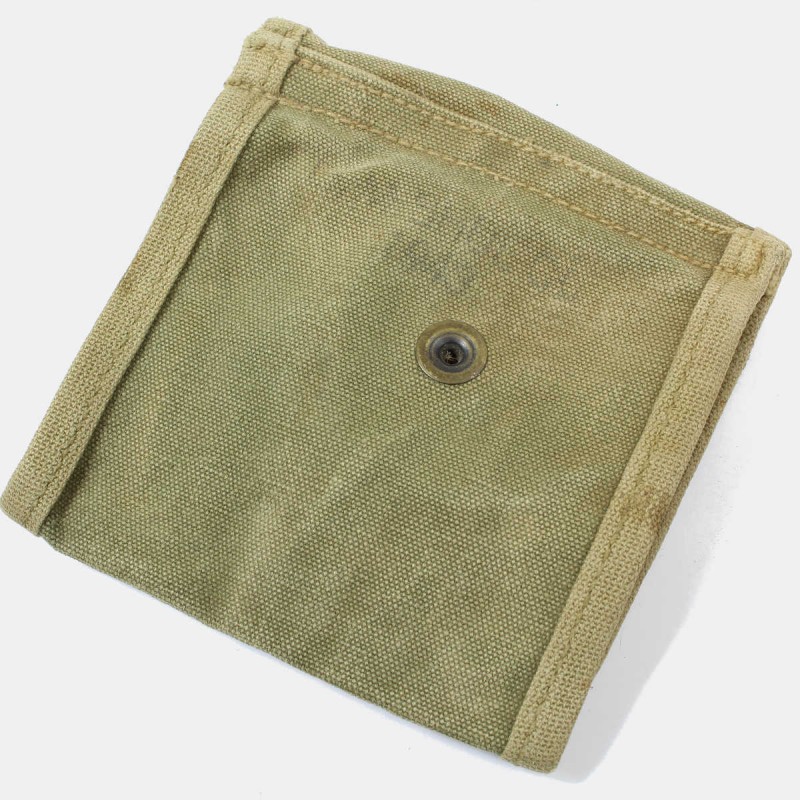 This magazine pouch is original and dates from 1943. It attaches to the M-36 belt and holds two M1 carbine magazines. This type of pouch was issued to US Army soldiers during World War II. It has a laundry number, and the internal divider has been unstitched.