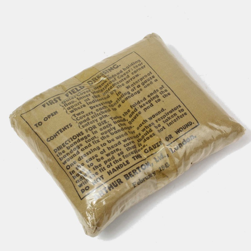 This bandage is original and still packaged in its original packaging. The set is dated 1943 and was provided to British Army soldiers during the Second World War.