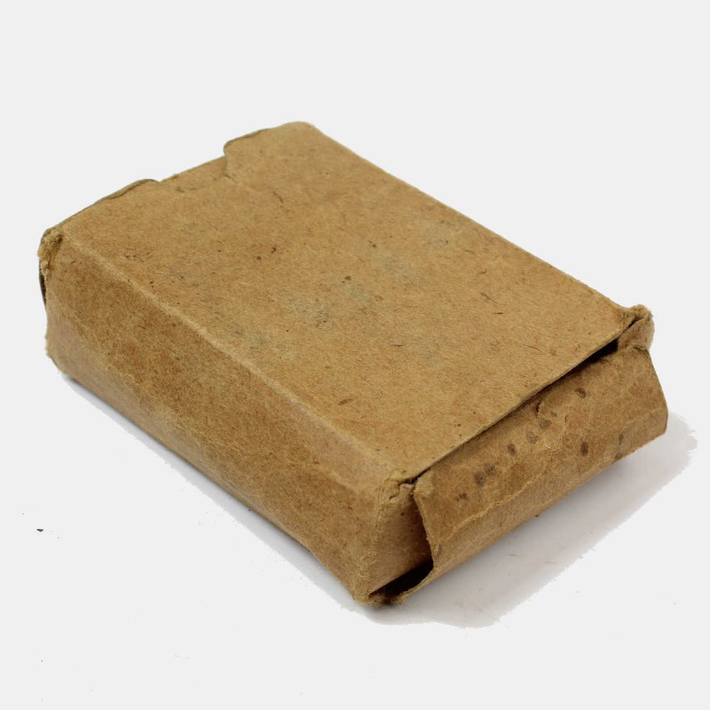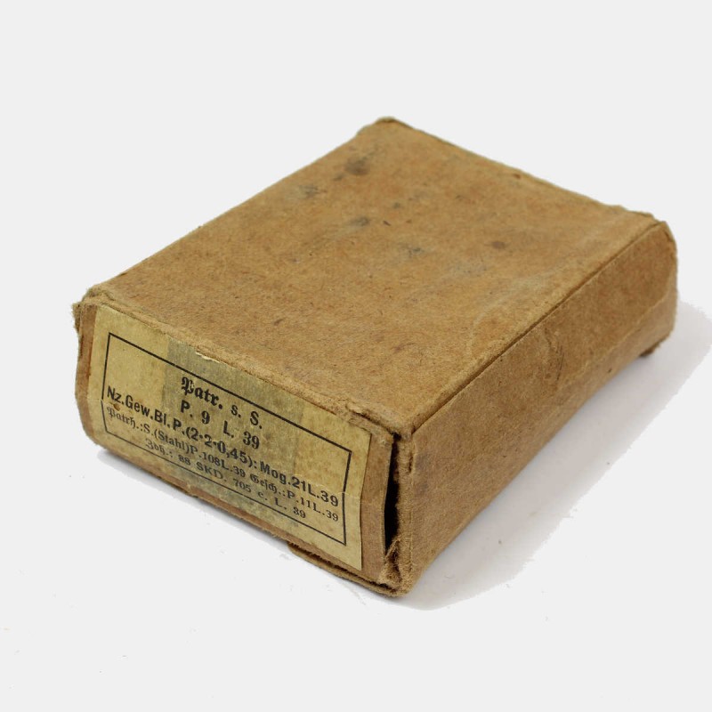 This small cardboard box is sold empty. These are original boxes used by the German army during World War II to package ammunition. This box is damaged.