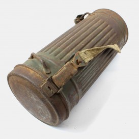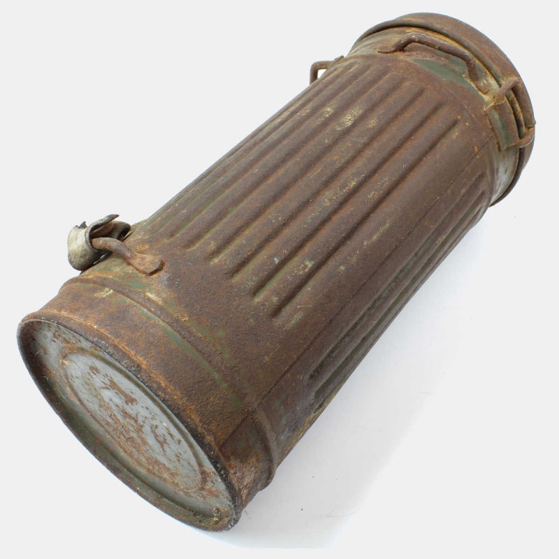 This gas mask container is an original find. This metal container was supplied to Wehrmacht (German army) soldiers to carry their individual gas masks. The box is dated 1943. Remains of paint.