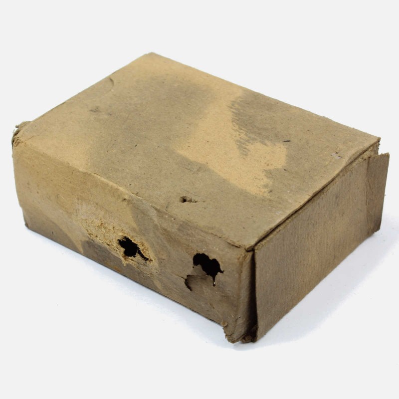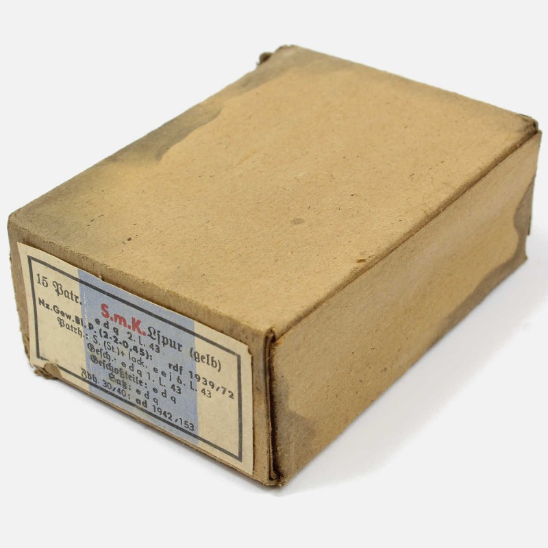 This small cardboard box is sold empty. These are original boxes used by the German army during World War II to package ammunition. This box is damaged.