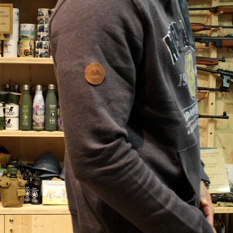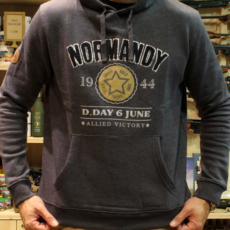 This sweatshirt is gray. Flocking on the chest and sleeve.