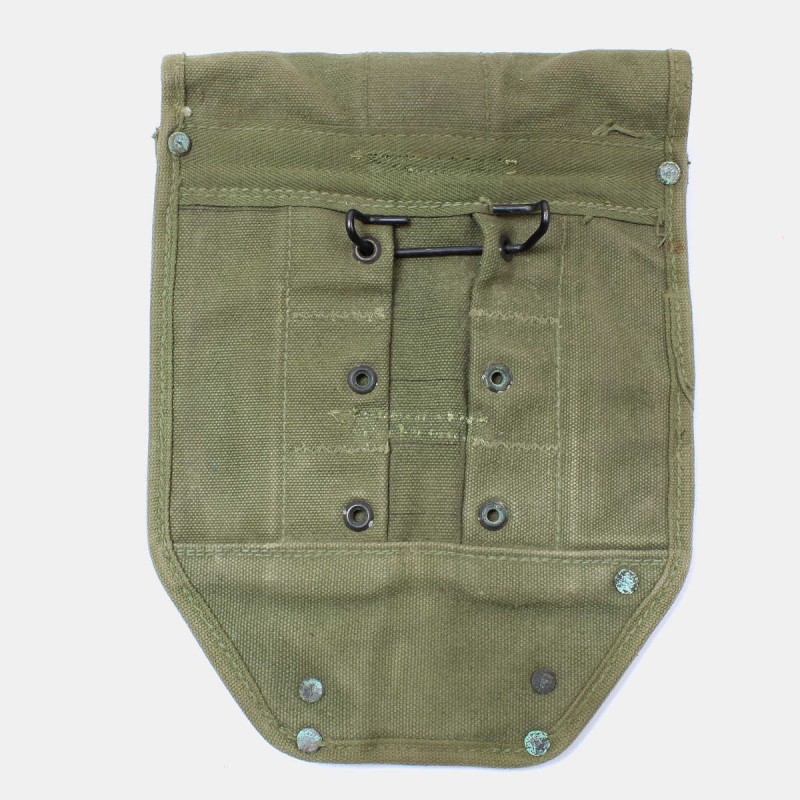 This canvas case can be used to carry the M-1943 shovel, often referred to as the "folding shovel", which unlike the "T-shovel" can be used as a pickaxe. This case is fitted with a hook, the second adjustable type, enabling the shovel to be held in place on the belt or on the M-1928 Havresac. The case is in good condition and is dated 1944.