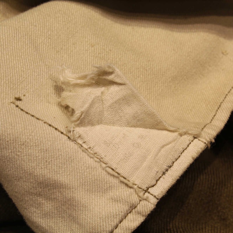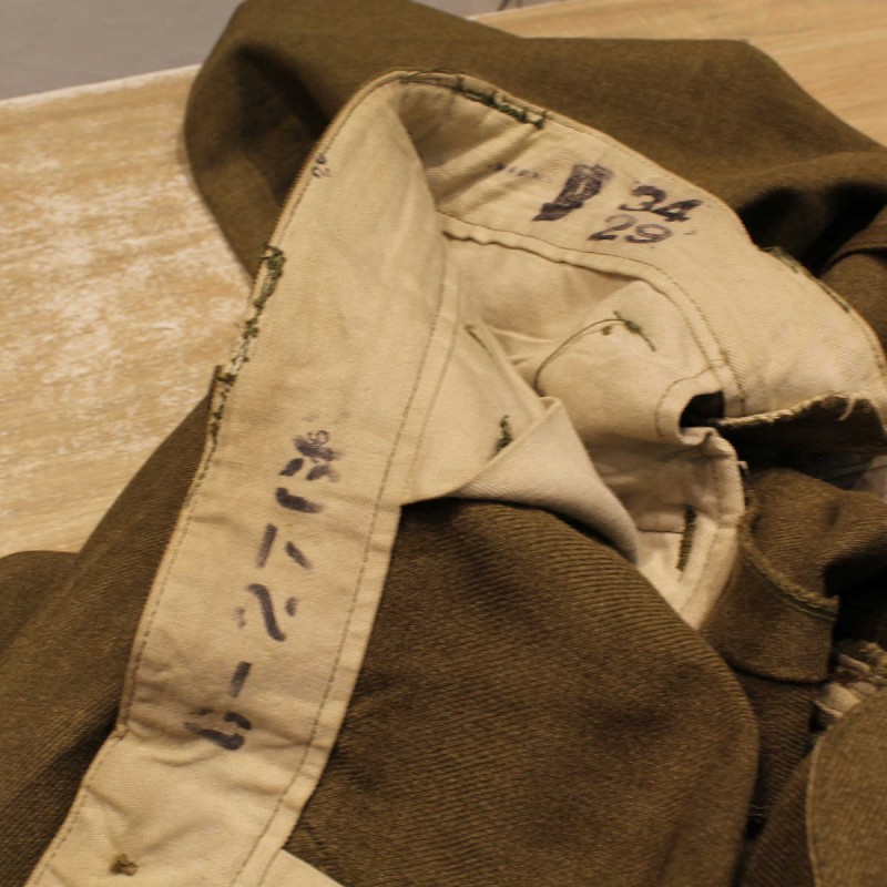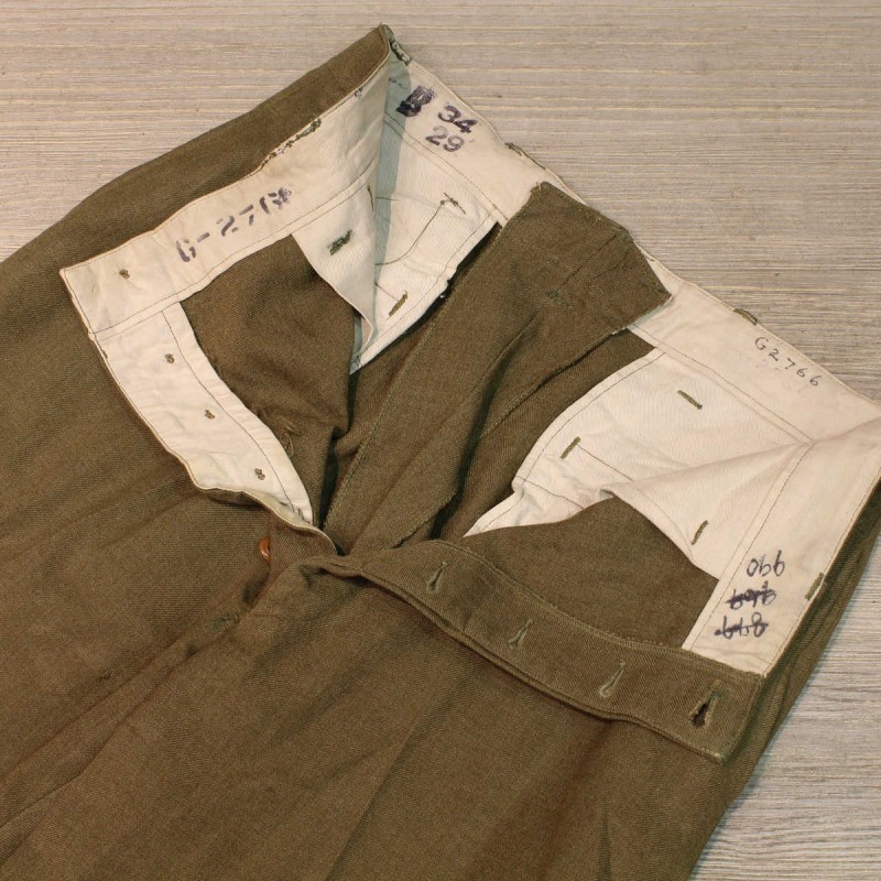 These pants are original and were issued to US Army soldiers during World War II. The manufacturer's label is present but faded. They are in good overall condition despite a few snags and repairs. Size 34 US. Laundry numbers present.
