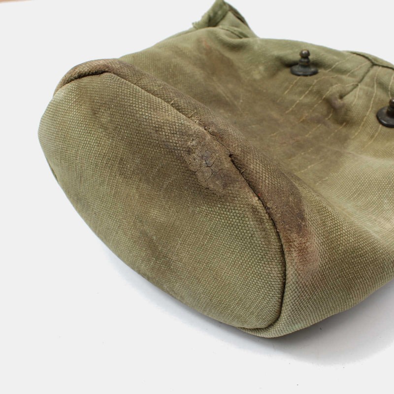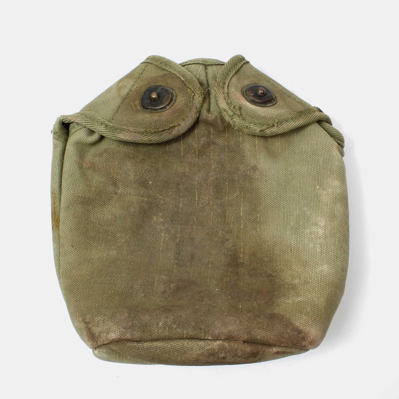 This cover was issued to all soldiers in the US Army to store their canteens and cups during World War II. This original cover shows signs of wear and the markings are legible (manufactured in 1945).