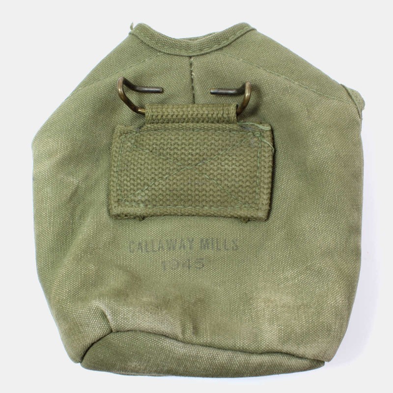 This cover was issued to all soldiers in the US Army to store their canteens and cups during World War II. This original cover shows signs of wear and the markings are legible (manufactured in 1945).