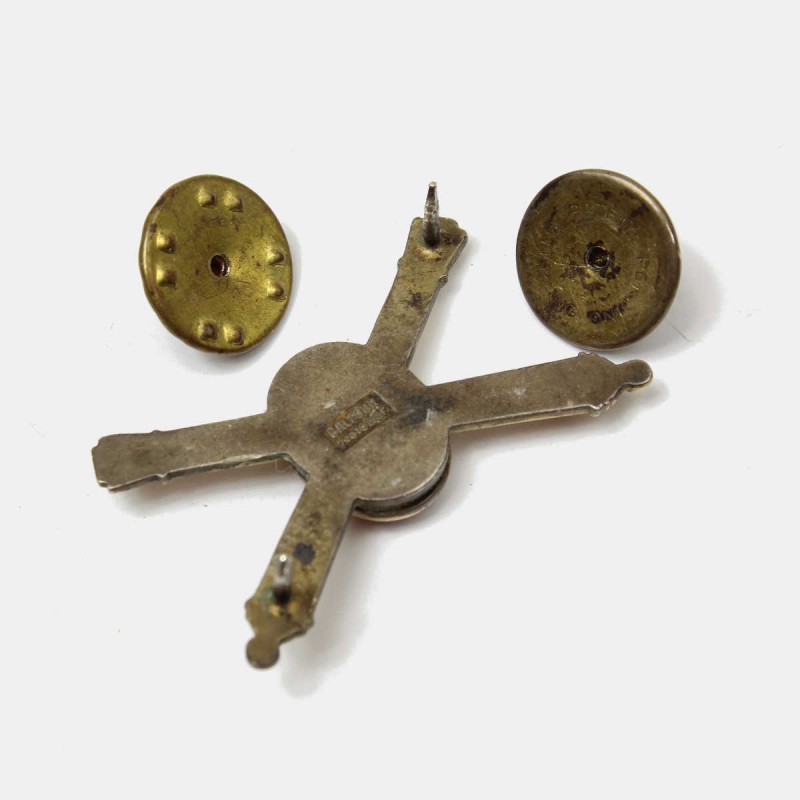This Coastal Artillery insignia is original and is attached using two pins. These insignia are worn on the collar of uniforms. Unlike the insignia for non-commissioned officers and enlisted personnel, the symbol is not affixed to a gold disc. This is the version for officers.