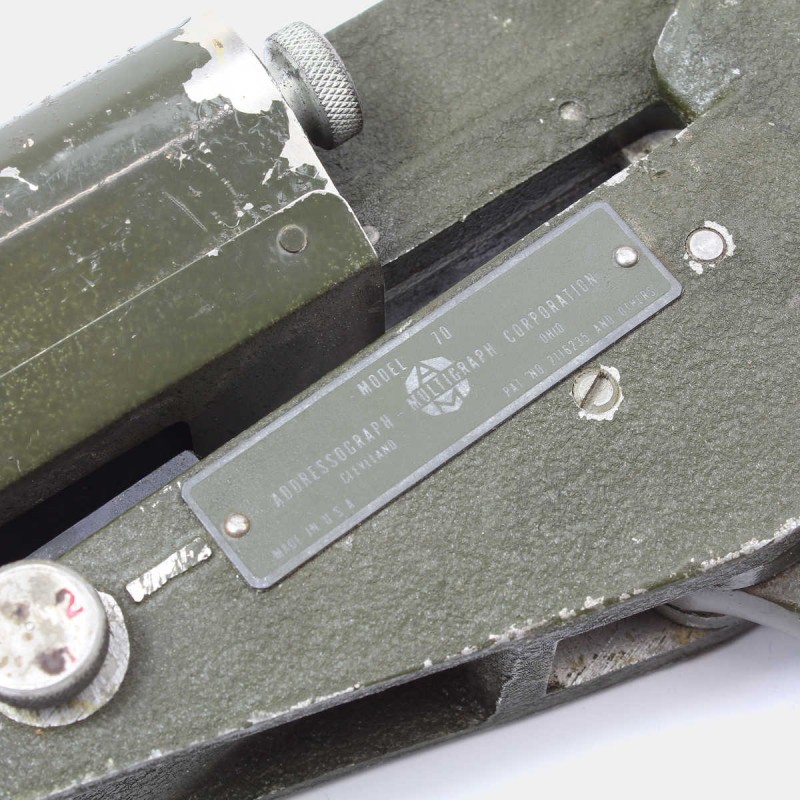 This Addressograph Model 70 is original and in good condition. It was used by the US Army Medical Department during World War II. This device has been tested and is still functional.