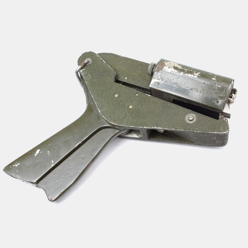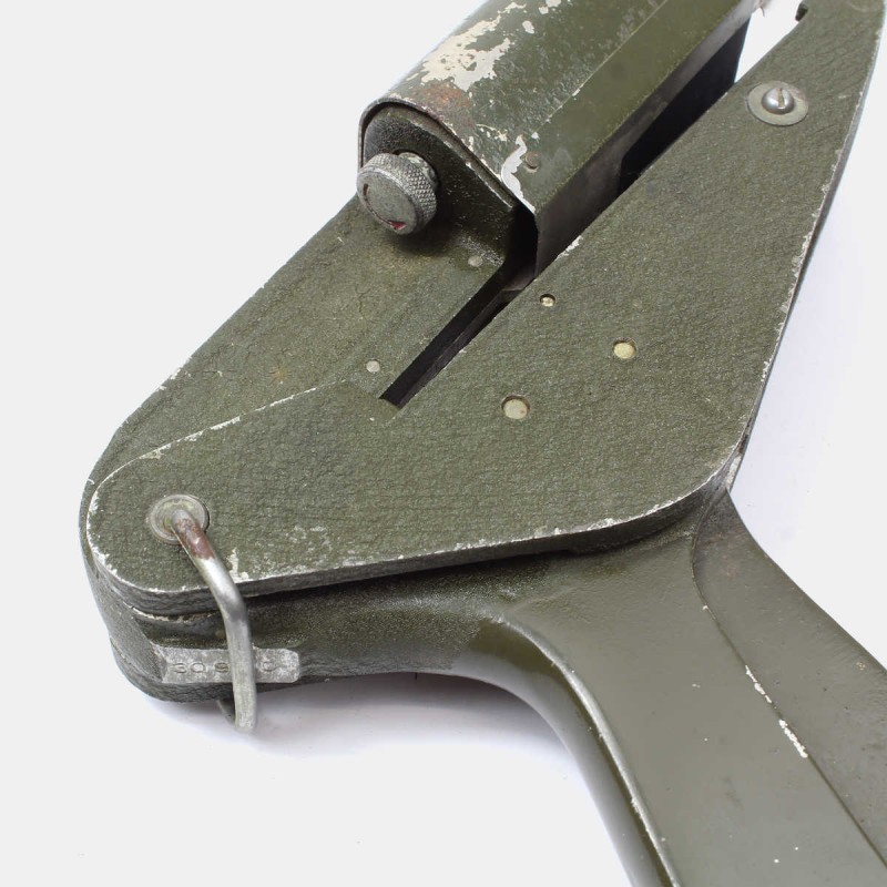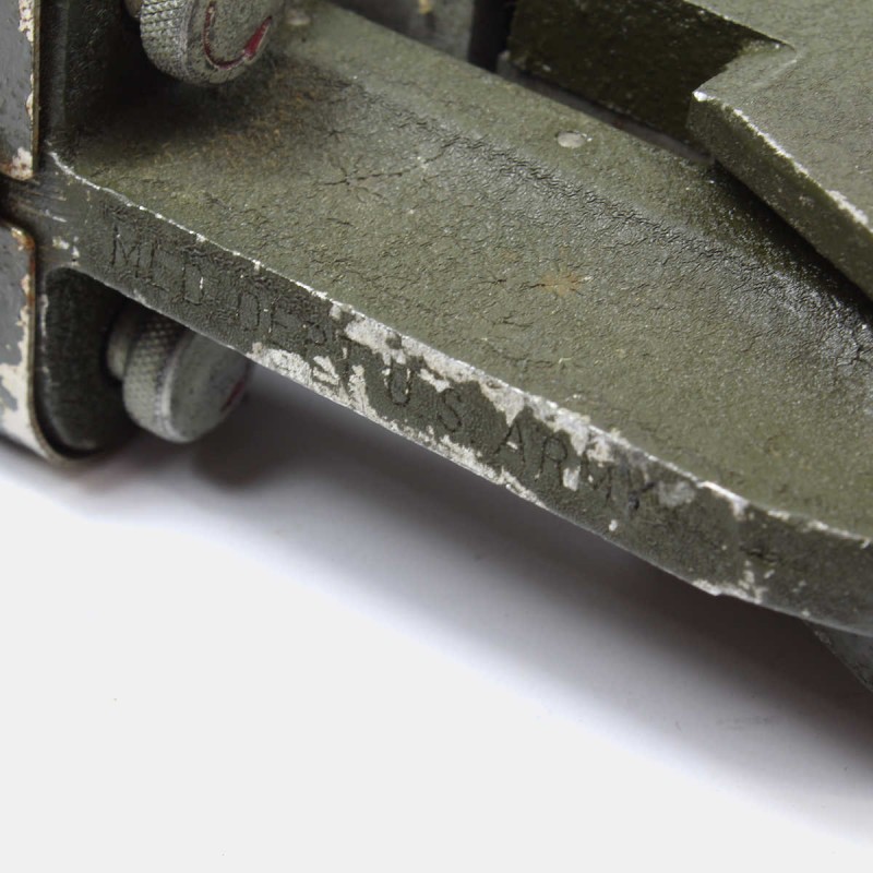 It was used to transcribe data from dog tags (identity tags) onto medical forms, like a stamp, by applying pressure once the tag was inserted.