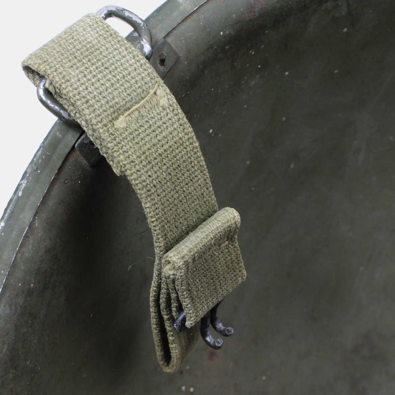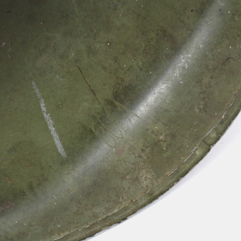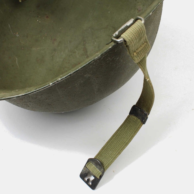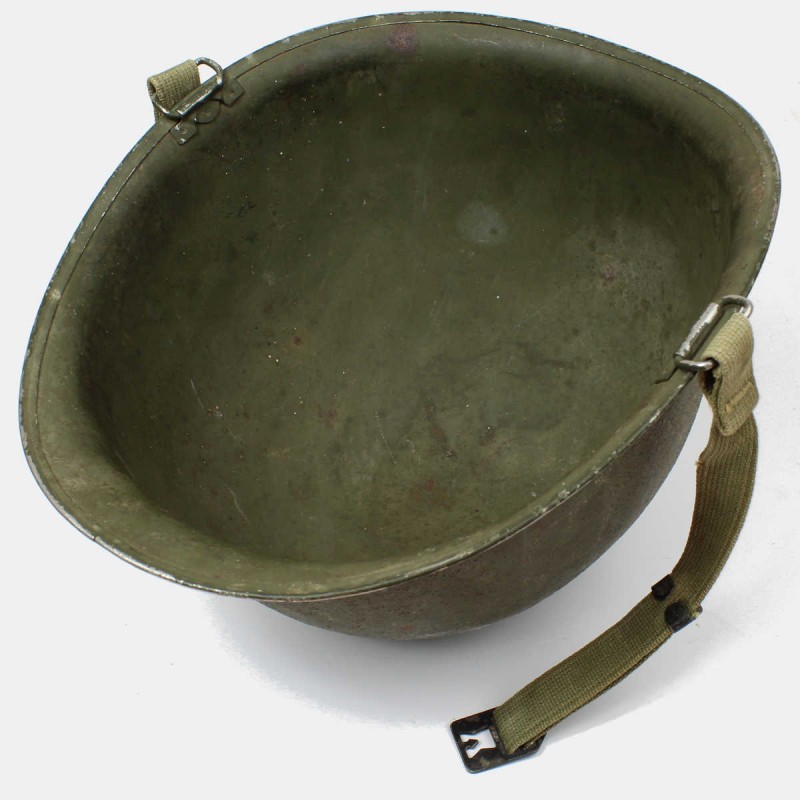This helmet shell is original and forms the heavy part of the US Army's M1 helmet during World War II. It is a model with movable chin straps, with welding on the front of the shell. This shell is in very good condition and still has its cork and paint, as well as its OD7 chin straps.