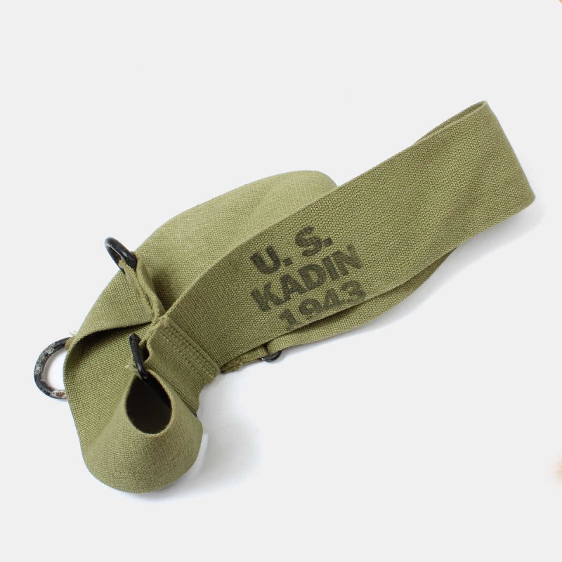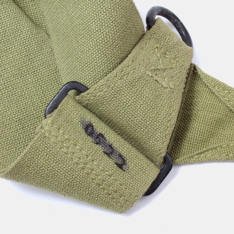 This multi-purpose strap is adjustable and equipped with two buckles. It fits the American M36 Musette bag so that it can be carried across the body or on the shoulder, but it also fits any bag equipped with hooks. The M36 musette bag was used by US Army paratroopers and many other US soldiers during World War II. It was also later used as a school bag by many schoolchildren and students. The manufacturer's markings are present, and the strap is dated 1943.