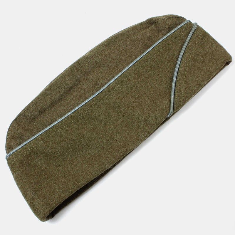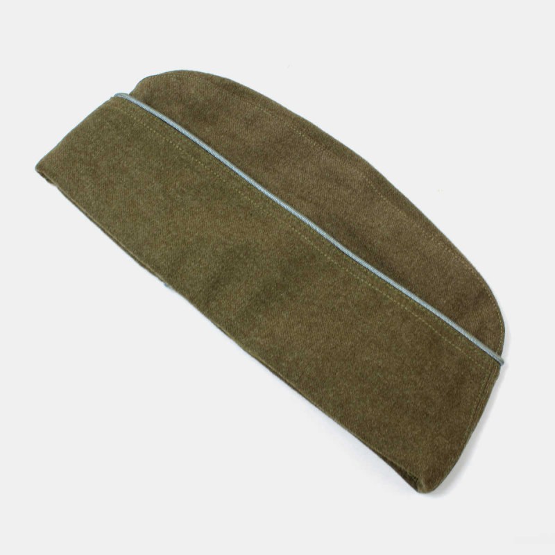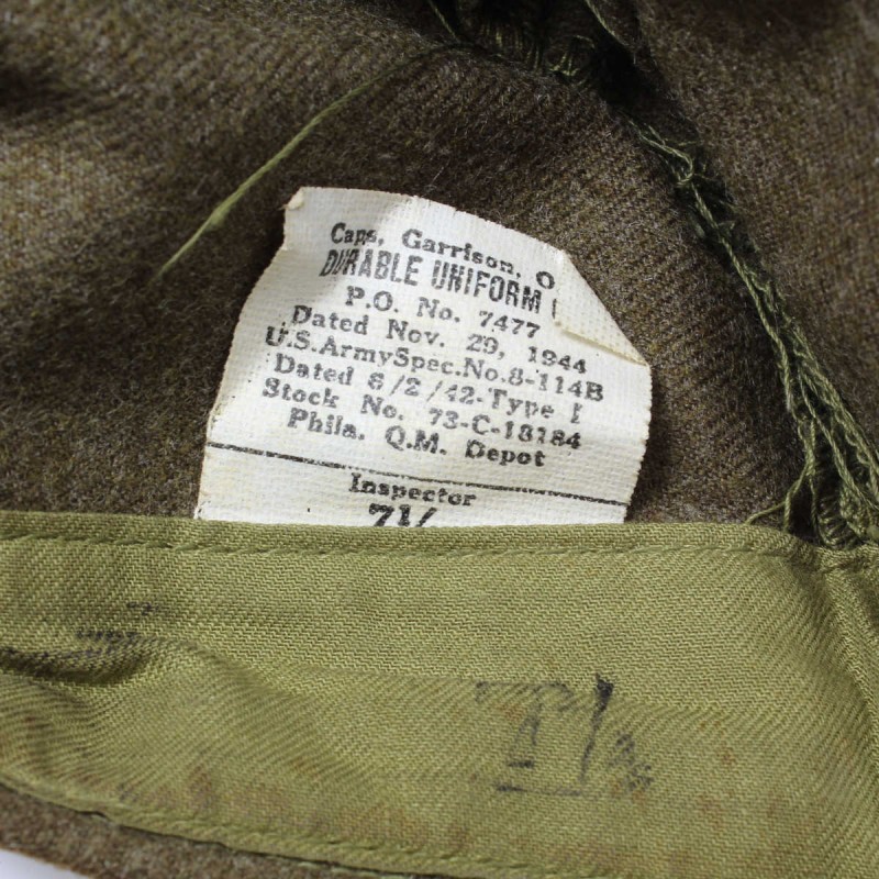 This original cap is made of green cloth. It was distributed during World War II to American soldiers, and the blue piping indicates that it was issued to a man assigned to the infantry. This cap is in very good condition, with a label dated 1944, size 7 1/4, and a laundry number.