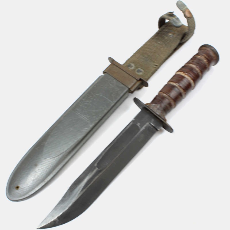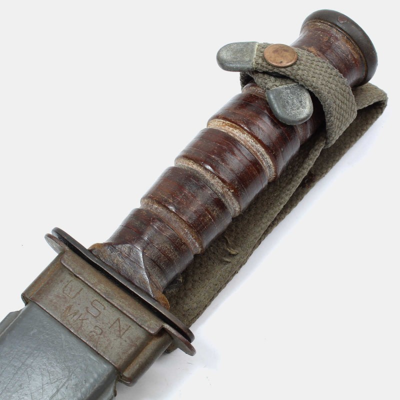 This dagger is original. It is a Mark 2 model supplied to the US Navy during World War II (USN) and manufactured by Camillus. The markings are visible. The Bakelite sheath is included with the knife. The set is in good condition.