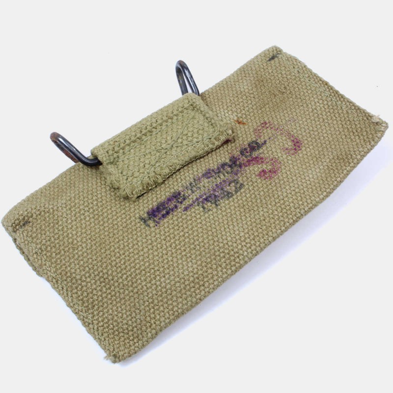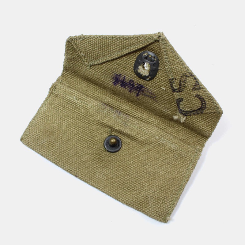 This first aid pouch is unique. It was widely distributed throughout the ranks of the US Army and carried on soldiers' belts. It contained an individual bandage, sometimes accompanied by a packet of sulfanilamide. This pouch shows signs of wear and dates from 1942.