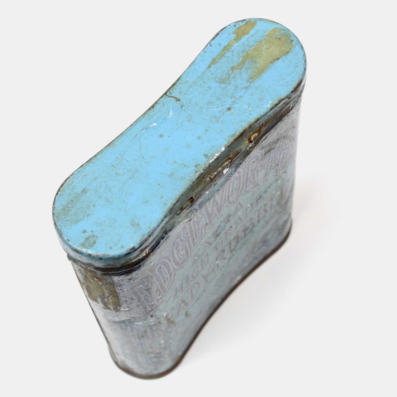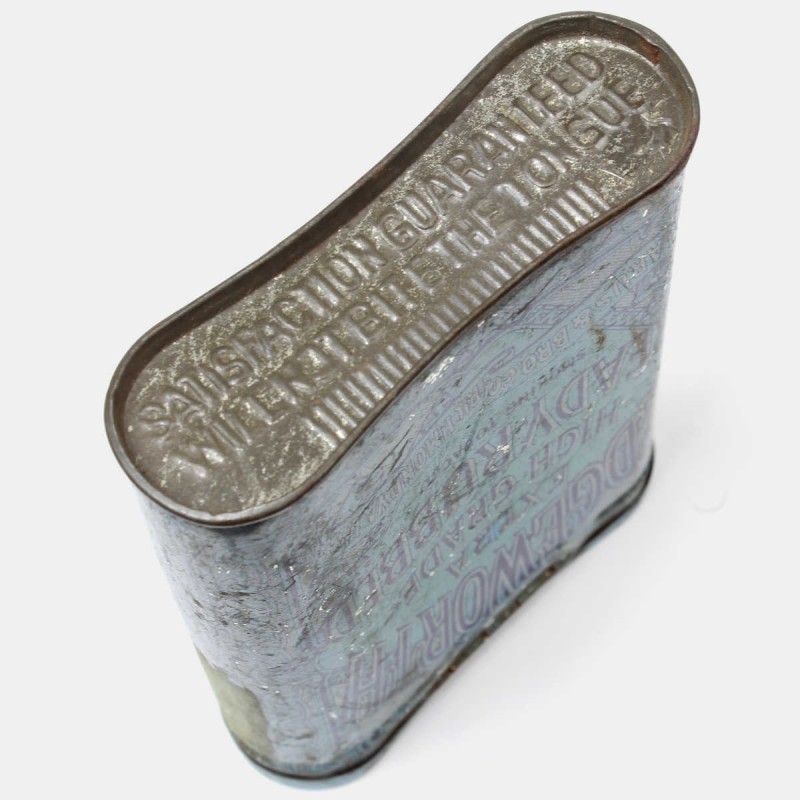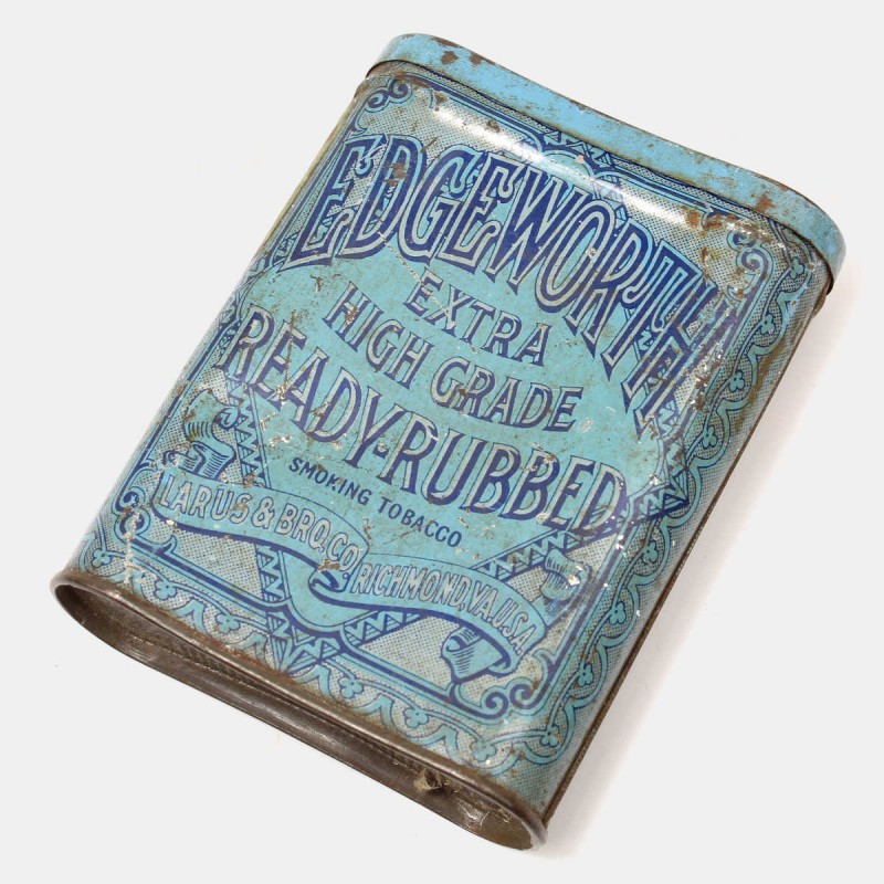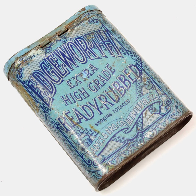 This metal box was manufactured by Edgeworth during the Second World War. Now empty, it contained tobacco and was distributed to American soldiers. The cover is present and the assembly shows signs of wear. Ideal for restoring a PX.