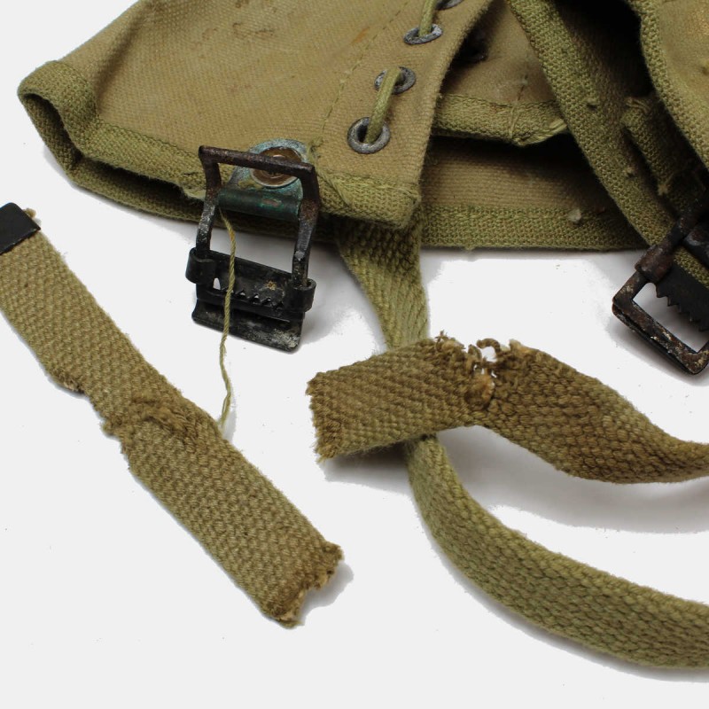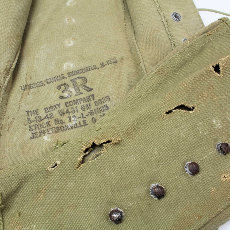 These gaiters are original, size 3R. They are in poor condition. The markings are still visible. Once laced up, they prevent damage to the bottoms of trousers and, more importantly, prevent water from seeping into shoes and under the uniform. They were worn by American soldiers during World War II.