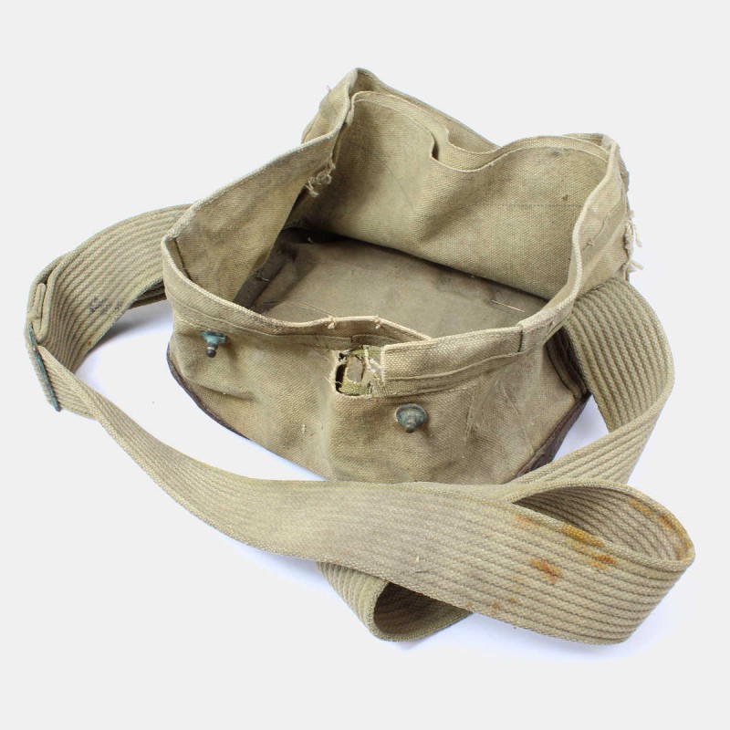 This CS-49 bag is original and was issued to US Army soldiers during World War II. It contained a Signal Corps telegraph. This bag is in poor condition, battlefield-issued, with a missing flap.