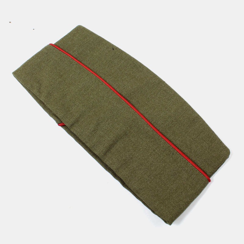 This original cap is made of green cloth. It was distributed during World War II to American soldiers, and the red piping indicates that it was issued to a man assigned to the Artillery. Size approximately 54, in good overall condition.