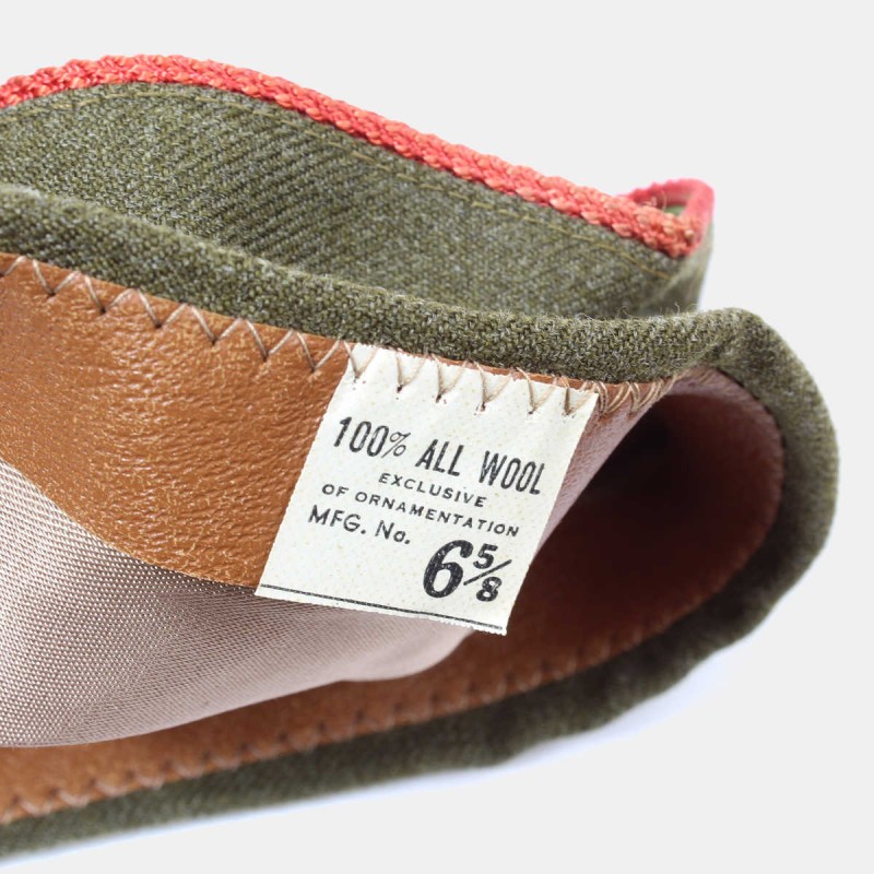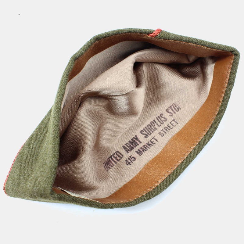 This original cap is made of green cloth. It was distributed during World War II to American soldiers, and the red piping indicates that it was issued to a man assigned to the Artillery. Size approximately 53, in good overall condition.