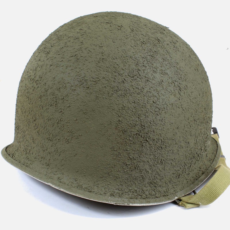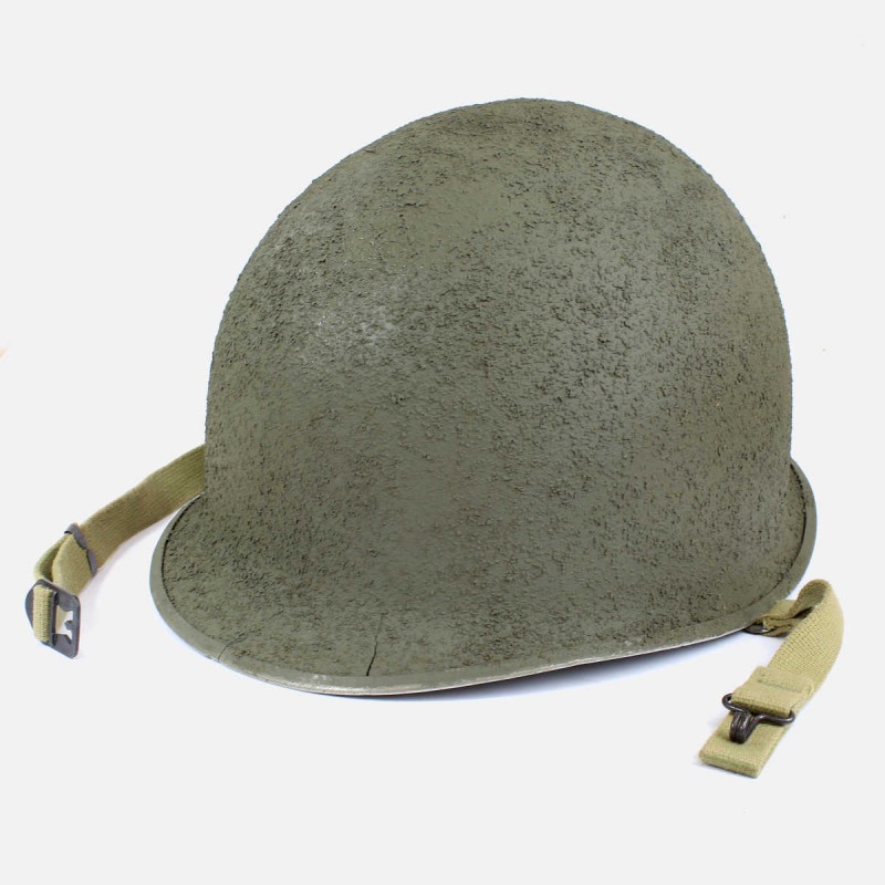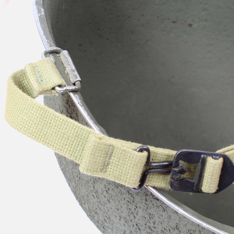 This helmet shell is original and forms the heavy part of the US Army's M1 helmet during World War II. It is a model with movable chin straps, with the ring welded to the front of the shell. This shell has been restored for reenactment. The anti-glare texture and paint have been redone. Reproductions of chin straps have been sewn on.