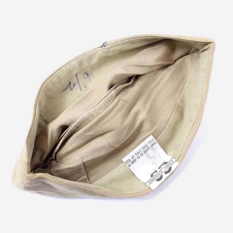 This original cap is made of chino cloth (beige). It was issued during World War II to American soldiers and the piping identifies it as having been issued to a man assigned to the Medical Corps. Size 54 approximately.