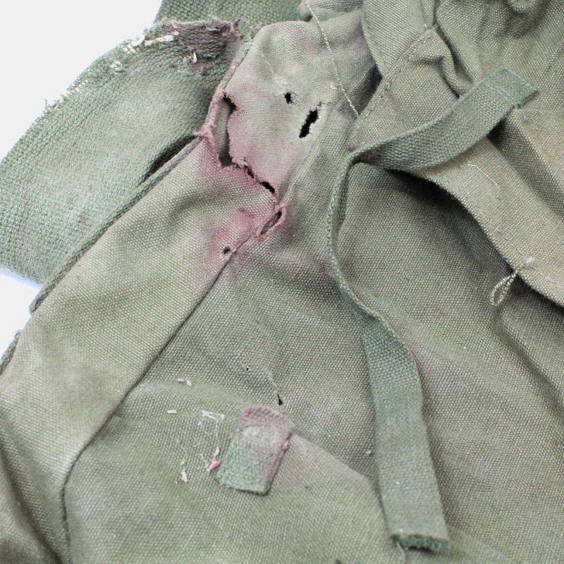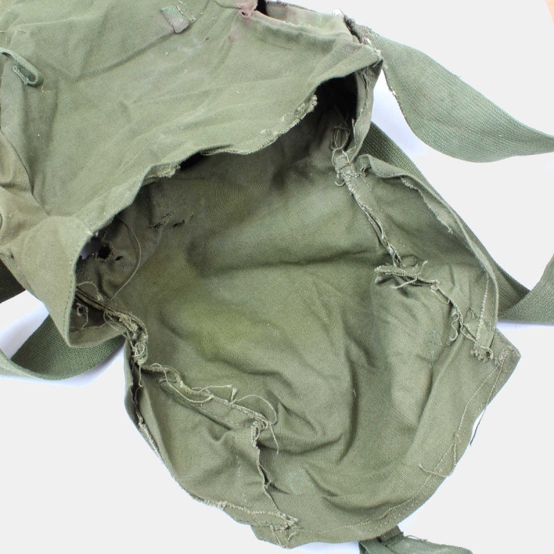 This musette bag is original and was used by US Army soldiers (Engineers) to carry eight demolition charges. This musette bag is in its original condition, with holes. A relic of the Battle of Normandy, it was found in the Carentan region.