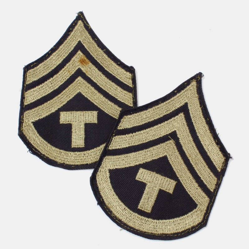 This pair of fabric grade is original. The three chevrons, the lower bar and the T symbolize the rank of T3 (Tech 3) of the US Army during the Second World War. This grade corresponds to the category of NCOs. These insignia are sewn on the sleeves of the jackets and shirts of the soldiers (Class A, HBT, M41, Winter ...).