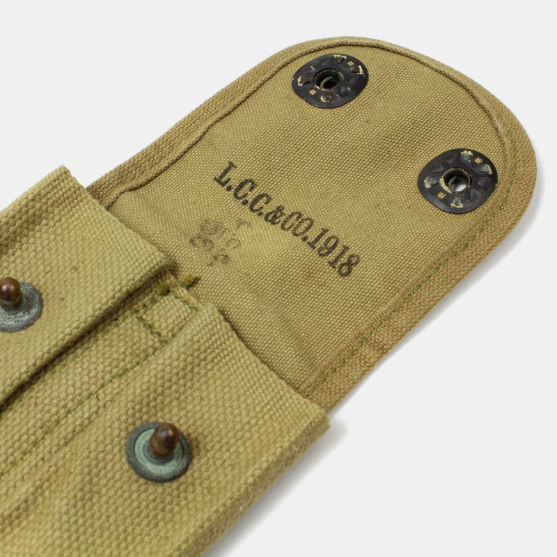 This charger for Colt 1911 is original and in good condition. This is a model released during the First World War but widely used during the Second. This model was distributed to all US Army personnel as long as it is equipped with a Colt automatic pistol. It can accommodate two Cal.45 loaders and the flap closes with two snaps.