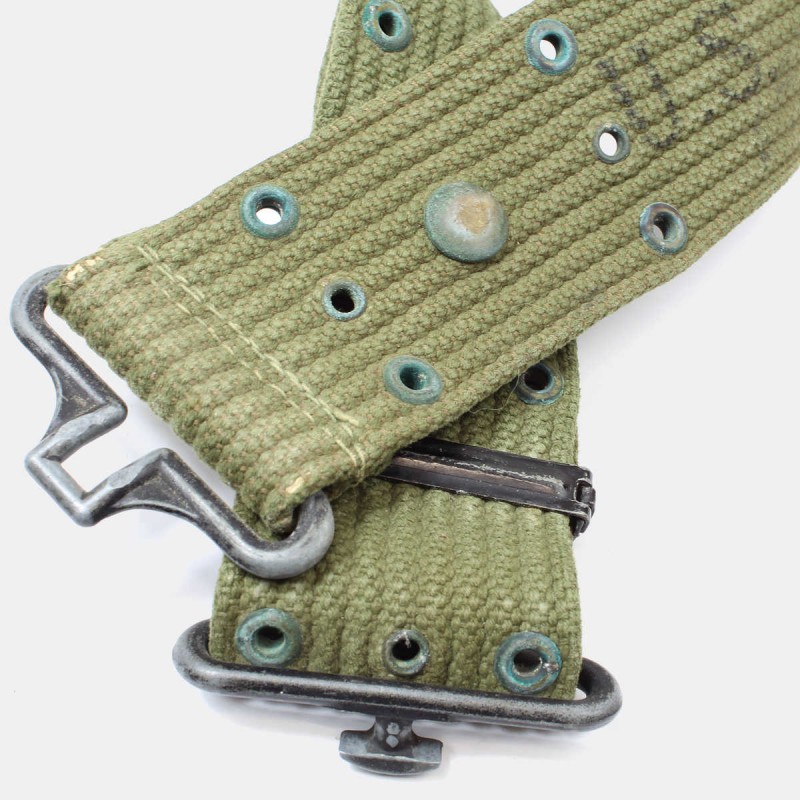 This original M36 belt was supplied during the Second World War to soldiers in the American army, enabling them to carry all their equipment. The eyelets can accommodate all types of accessories (shovel, musette, bag, pouch, magazine holder, etc.). This belt is in very good condition and dated 1944. OD7 tinted.