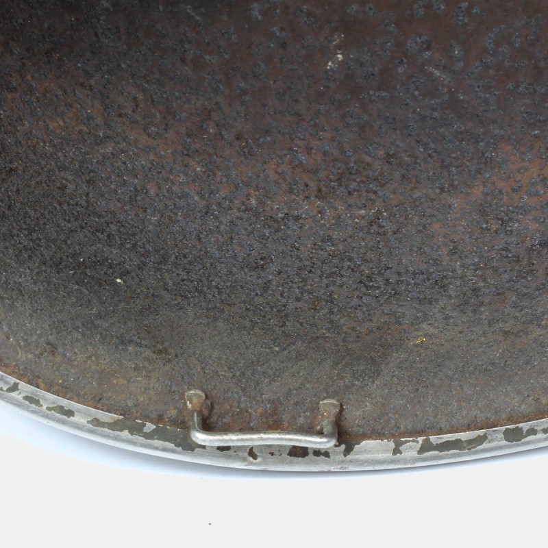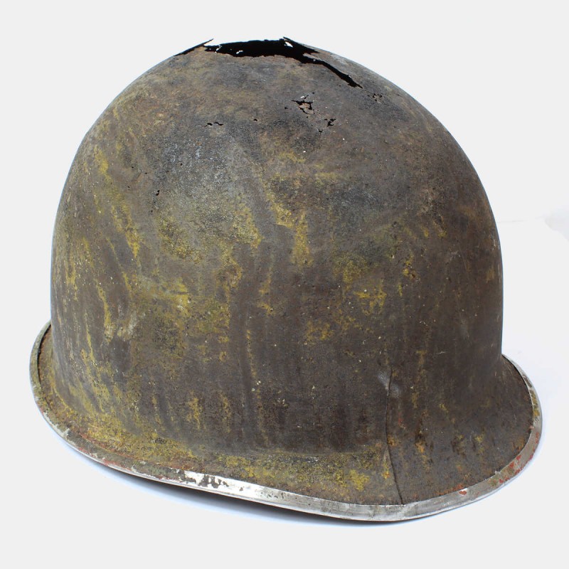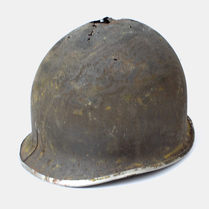 This American M1 helmet shell is original. This type of helmet was used by American soldiers during World War II. It bears the scars of the battlefield. To be displayed in a showcase of combat relics. One crack, holes, and fixed bridges present. Local provenance.