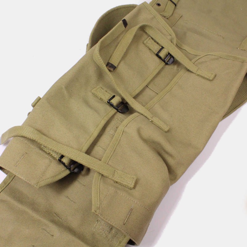 This M-1928 model backpack (Haversack or Havresac) is an evolution of the M-1910 model used during World War I. It has two small straps on the back. All straps are equipped with hooks that allow it to be attached to the belt, enabling soldiers to carry their belongings to the front. The mess kit pouch is included with the bag. The two metal eyelets on the flap are used to attach the bayonet, while those on the canvas patch are used to attach the shovel (M-1910 or M-1943 folding). This bag was an essential accessory for American infantrymen during World War II. Available in an “eco” version.