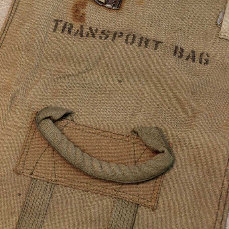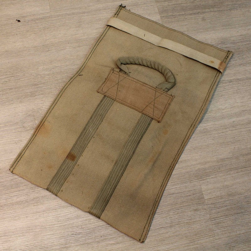 Ce sac en toile épaisse est original. A l'aide de deux cordes de renfort, il permettait aux soldats de l'armée américaines de transporter des charges lourdes lors de la Seconde Guerre mondiale. L'article montre des signes de stockage mais reste en bon état et solide comme à l'origine.