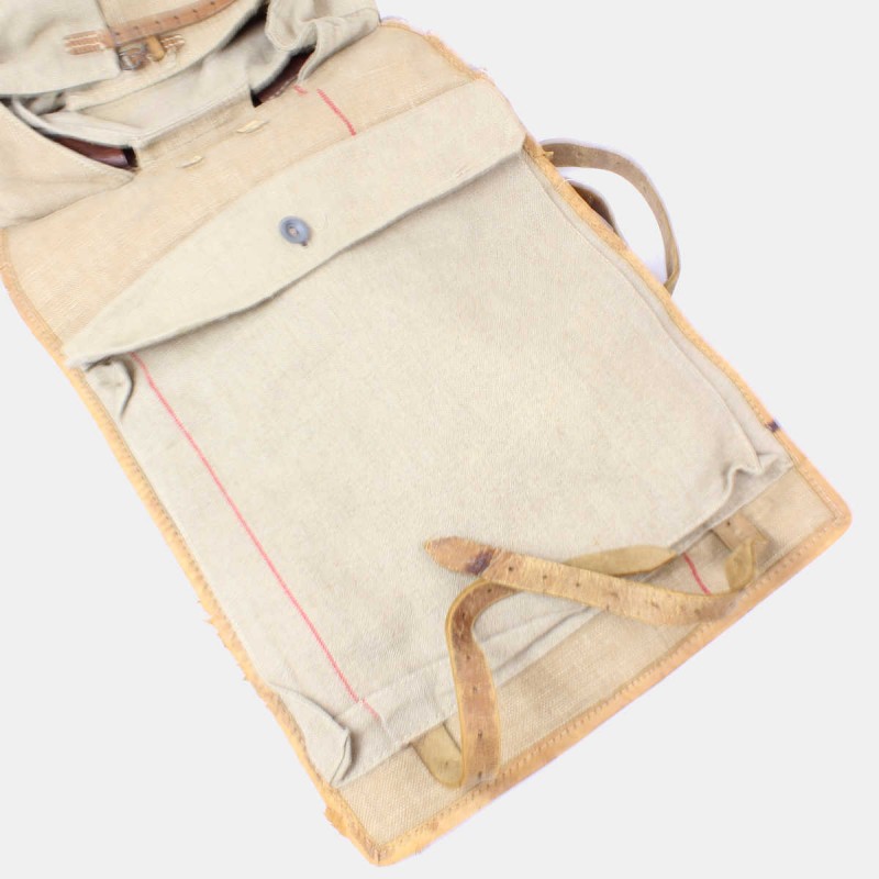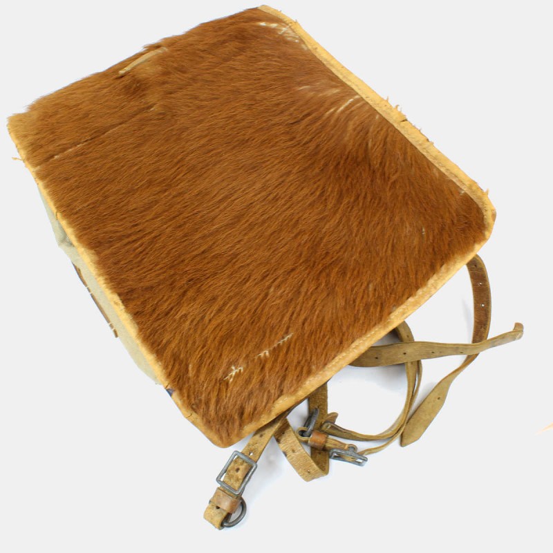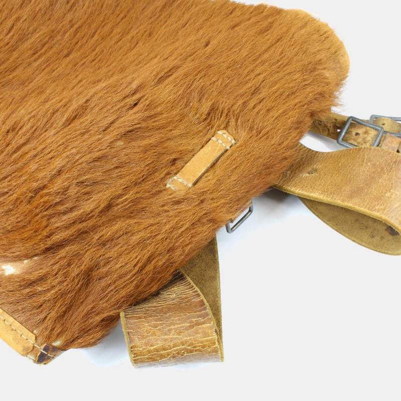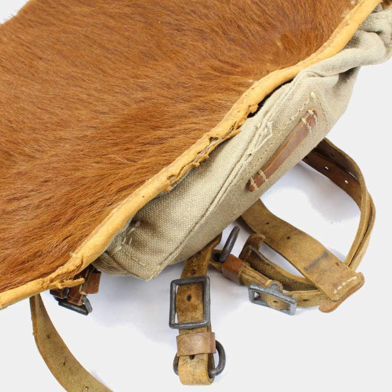 Ce sac est original et en bon état général. Le tornister surnommé "Peau de vache" est porté par les soldats de l'armée allemande durant la Seconde Guerre mondiale. Cette version se porte en sac à dos, il faudra cependant ajouter deux crochets métalliques sur les sangles prévues à cet effet si vous souhaitez le fixer au ceinturon. Cet exemplaire est daté de 1944.