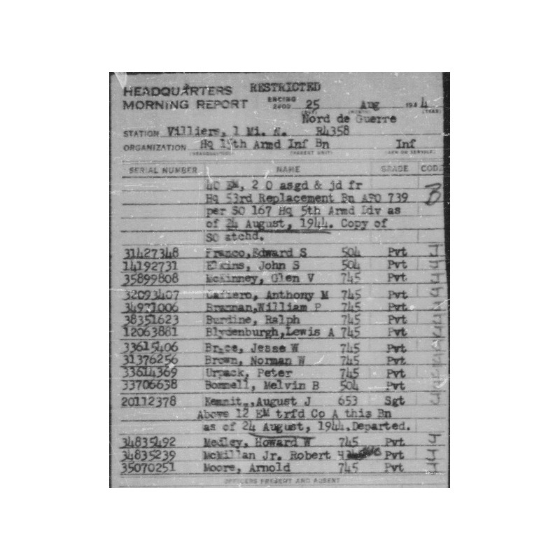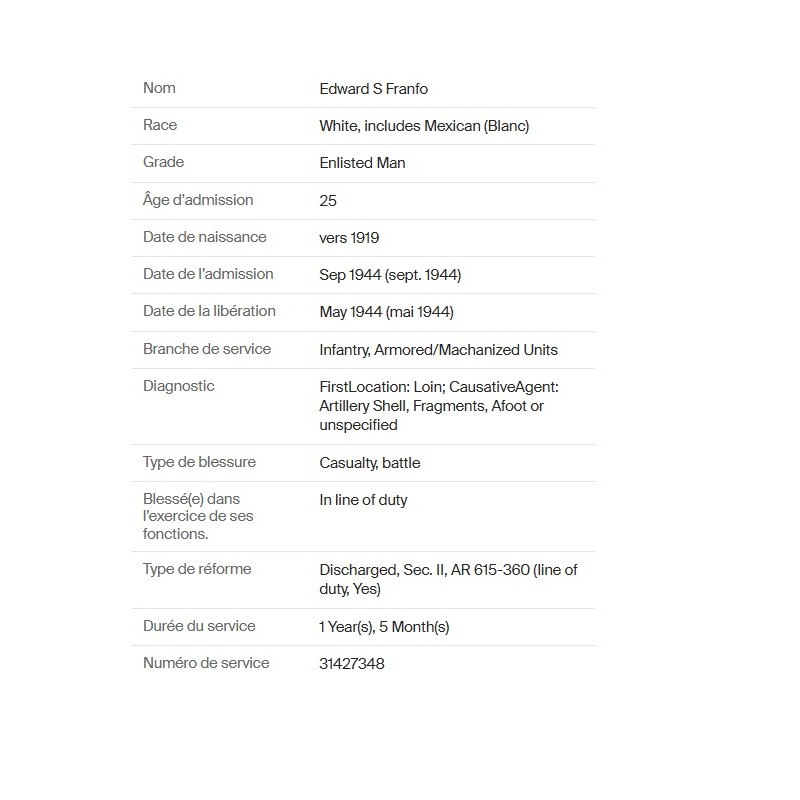 Edwerd Franfo faisait partie du 15th Armored Infantry Regiment de la 5th Armored Division. Il sera grievement blessé en Normandie en Août 1944 puis démobilisé.