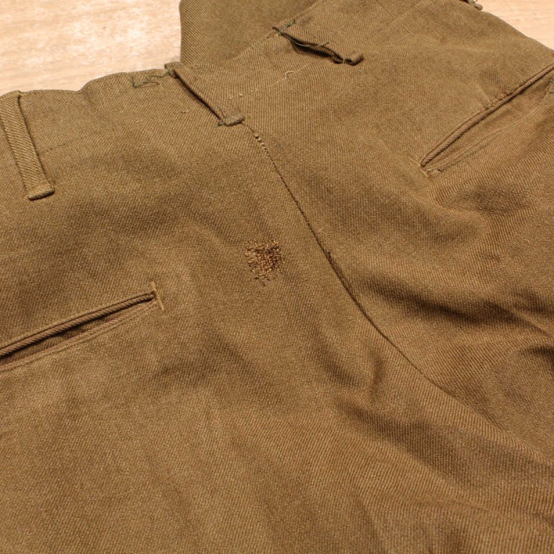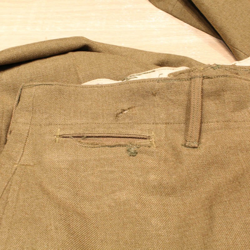 Ce pantalon est original et fourni aux soldats de l'armée américaine durant la Seconde Guerre mondiale. L'étiquette du fabricant est présente mais délavée. Il est en bon état général malgré quelques accrocs et réparations. Taille 34 US. Présence de laundry numbers.