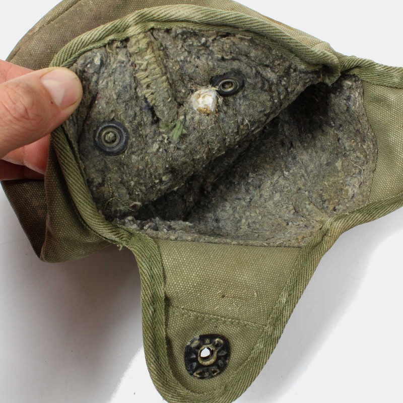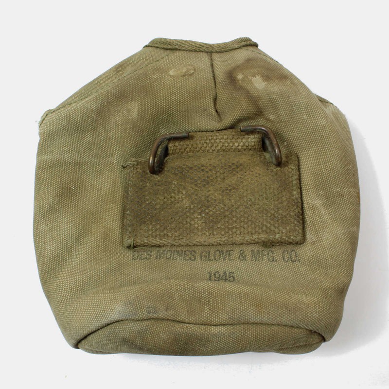 Cette housse est fournie à tous les soldats de l'armée américaine afin de ranger la gourde et le quart durant la Seconde Guerre mondiale. Cette housse originale montre des signes d'usure et les marquages sont lisibles ( fabrication de 1945).