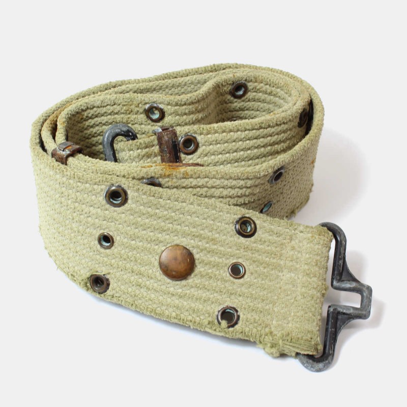 Ce ceinturon M36 est original, fourni durant la Seconde Guerre mondiale au soldat de l'armée américaine afin de fixer sur lui tout son équipement. Les oeillets peuvent recevoir ainsi tous les types d'accessoires (pelle, musette, sac, brelage, porte-chargeurs, ...). Ce ceinturon est en mauvais état.