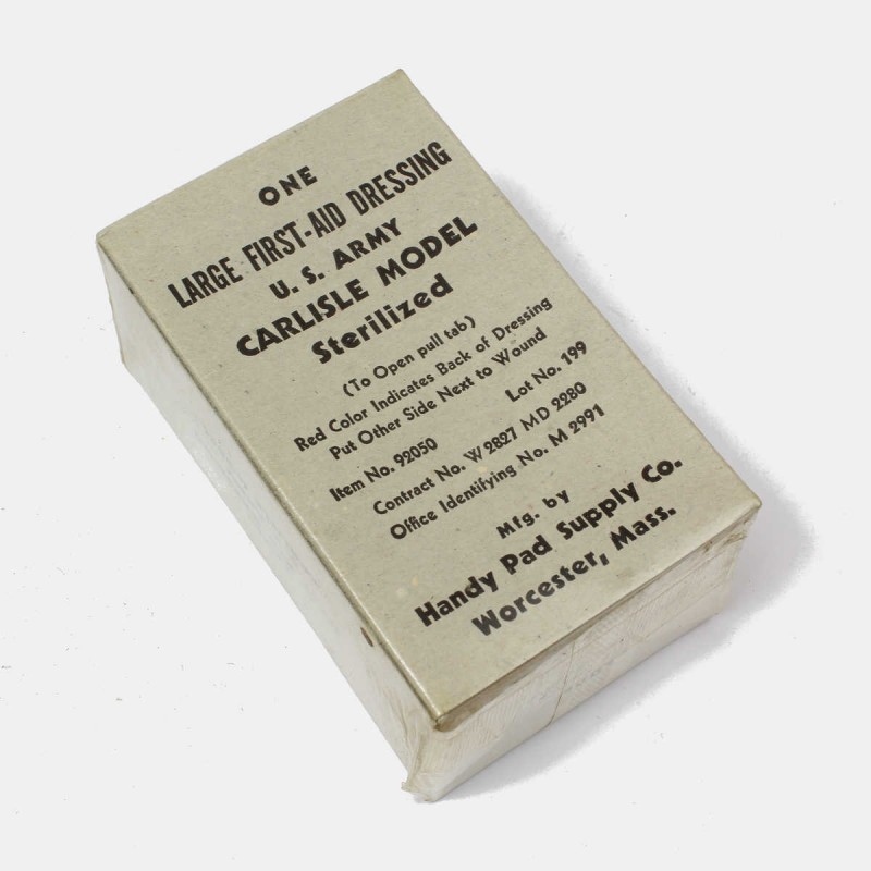 Bandage original jamais déballé encore conditionné dans son carton. Produit pour l'armée américaine lors de la Seconde Guerre mondiale. Cette pièce de stock est dans son état d'origine. Vous recevrez un bandage.