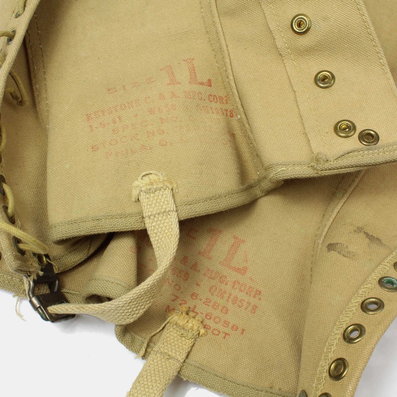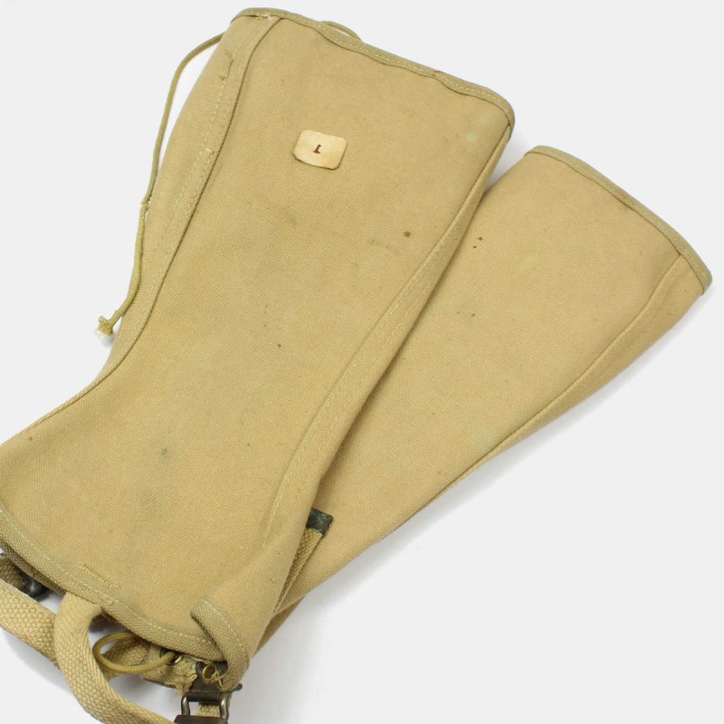 Ces guêtres sont originales, de taille 1L. Elles sont en bon état général, bien marquées et datées de 1941. Une fois lacées, elles permettent de ne pas abîmer les bas de pantalon mais surtout d'empêcher l'eau de s'infiltrer dans les chaussures et sous l'uniforme. Version précoce, avec bouclerie laiton oxydée. Manque un lacet sur une guêtre.