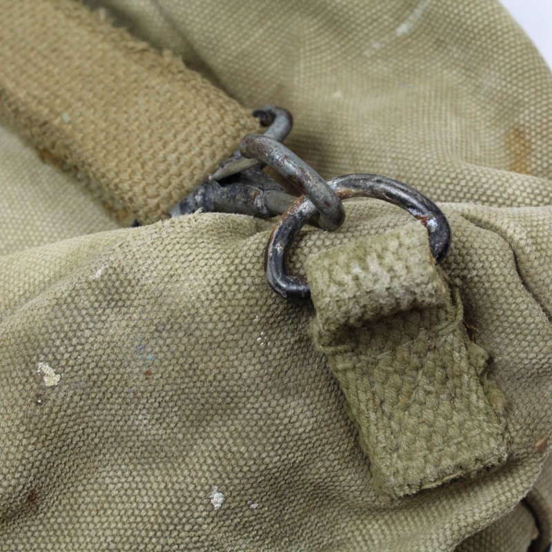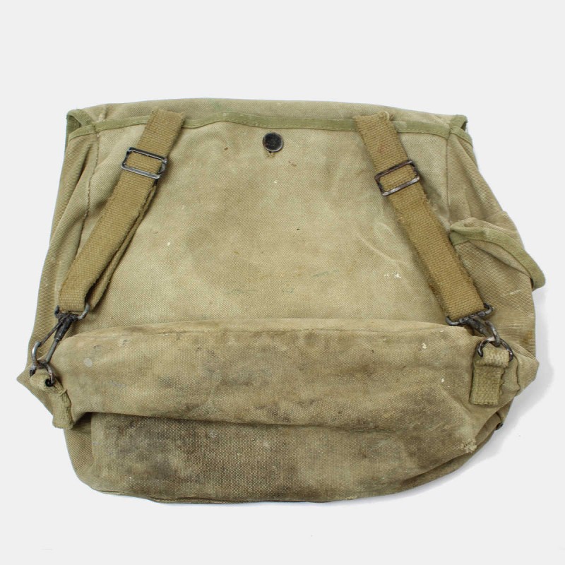 Cette musette modèle 1936 est originale et fournie à l'armée américaine durant la Seconde Guerre mondiale. Utilisée par les parachutistes, elle est également très présente parmi les effets des officiers des autres unités. Cet exemplaire montre des signes d'usure et est daté de 1943.