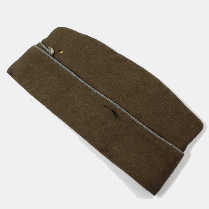 Ce calot original est confectionné en drap vert. Il a été distribué durant la Seconde Guerre mondiale aux soldats américains et le liseret de couleur bleue permet de déterminer qu'il a été attribué à un homme affecté à l'infanterie. Cette coiffure montre des trous de mites sur une face. La taille est 7. Etiquette présente, difficilement lisible.