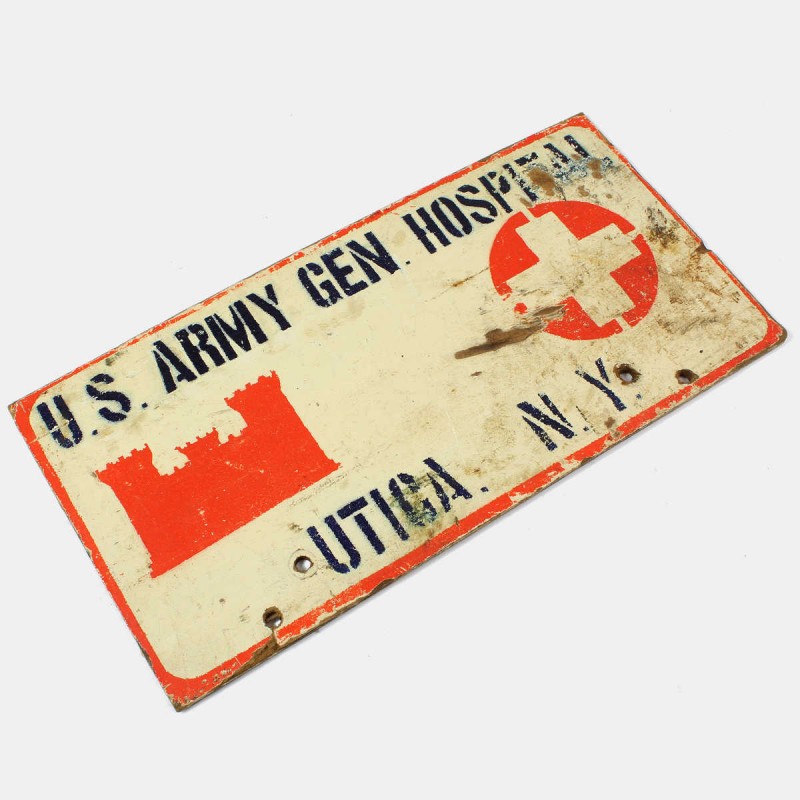 Panneau original confectionné en plaque carton rigide et mesurant 150x300mm, indiquant un General Hospital de l'US Army aux Etats-Unis (UTICA, NY).