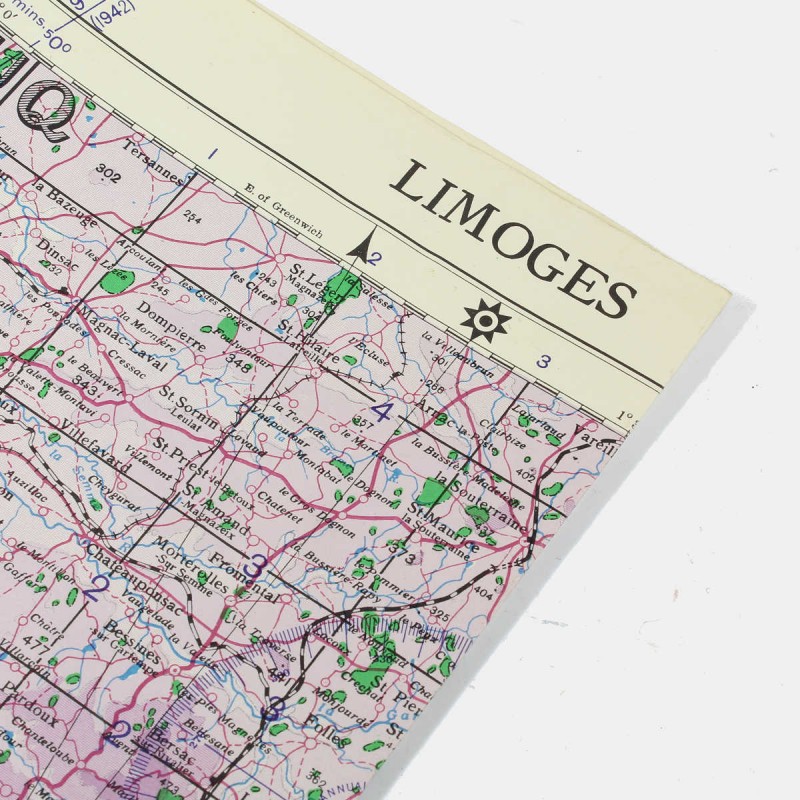 Cette carte au 1/25 000e est originale et utilisée par les soldats de l'armée américaine durant la Seconde Guerre mondiale. Il s'agit de la région de Limoges. Cette carte est datée de 1943.