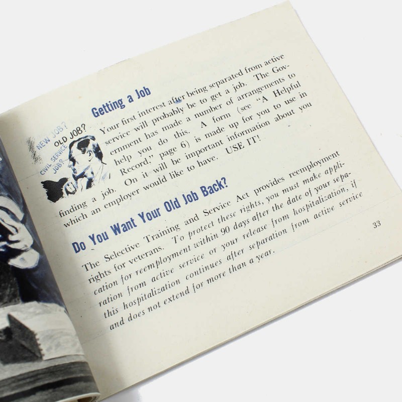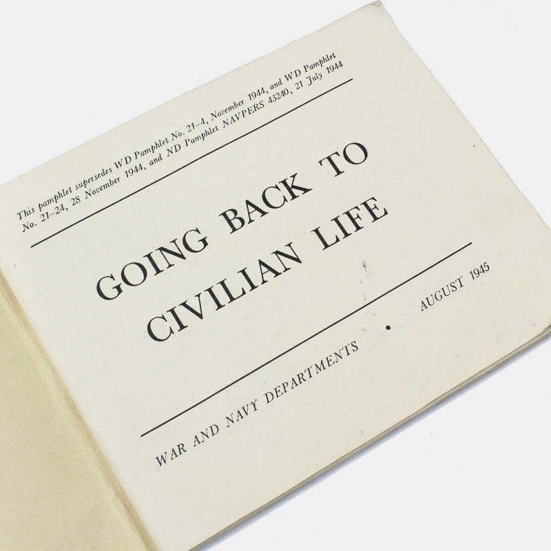 Ce livret est original et daté de 1945. Il s'agit du livret de démobilisation remis à chaque soldat lorsqu'il quitte l'armée à la fin de la Seconde Guerre mondiale. Il lui explique comment retourner à la vie civile malgré les séquelles de la guerre (comment trouver du travail, etc...).