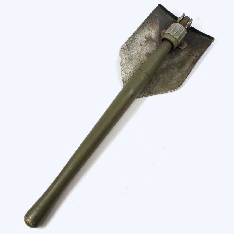 La pelle pliante M43 vient remplacer peu à peu la pelle droite M-1910. Elle se loge dans une housse en toile spécifique et munie d'un crochet pour porter l'ensemble au ceinturon ou sur un sac. Cet exemplaire originale est en bon état, les marquages sont lisibles et on y distingue la date de fabrication et le fabricant : WOOD 1944. Utilisée par toute l'armée américaine durant la Seconde Guerre mondiale.