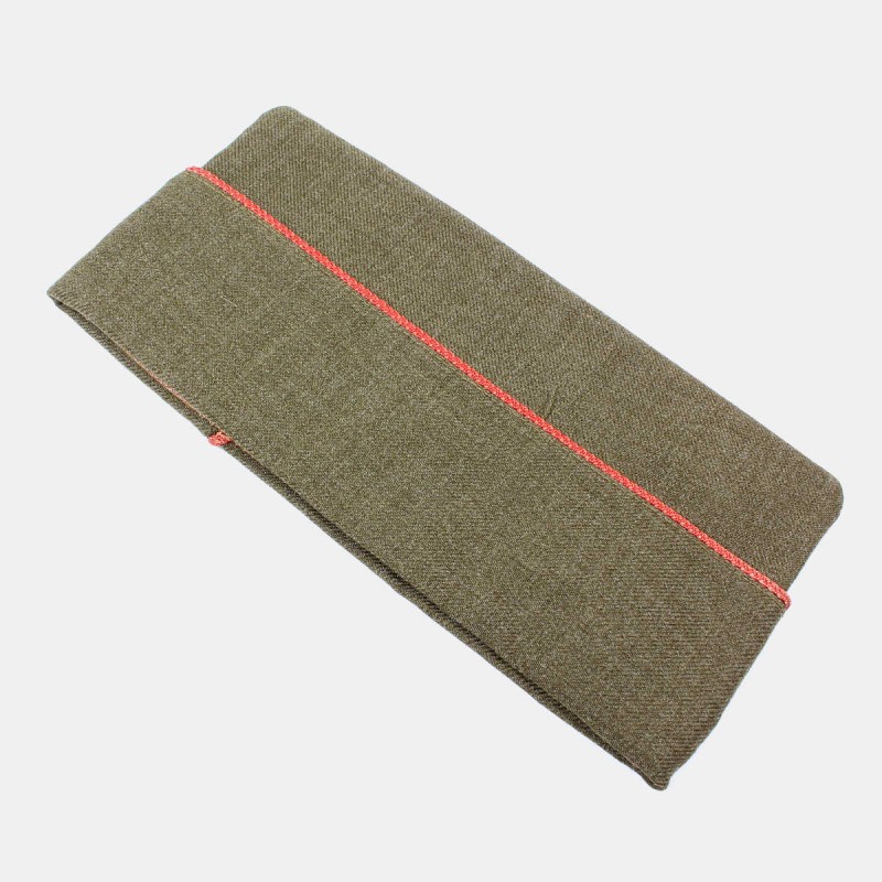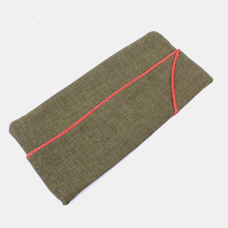 Ce calot original est confectionné en drap vert. Il a été distribué durant la Seconde Guerre mondiale aux soldats américains et le liseré de couleur rouge permet de déterminer qu'il a été attribué à un homme affecté à l'Artillerie. Taille 53 environ, Bon état général.