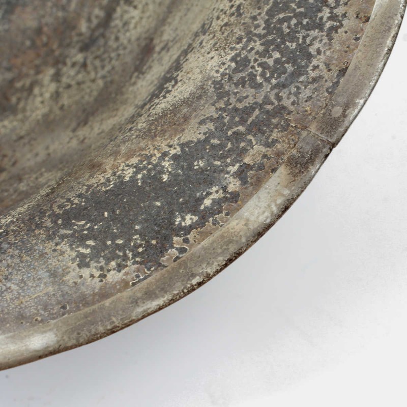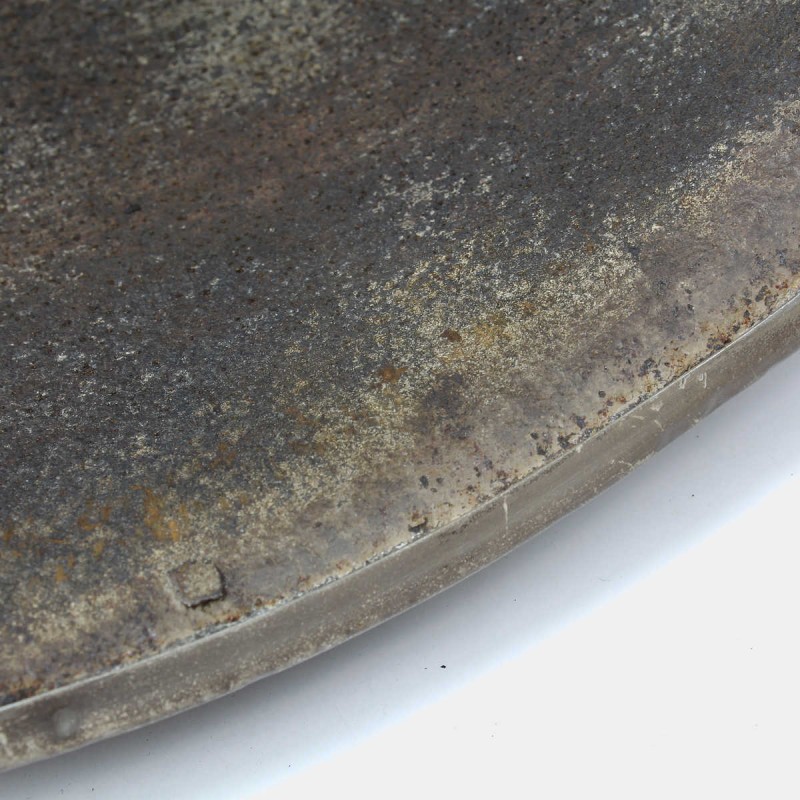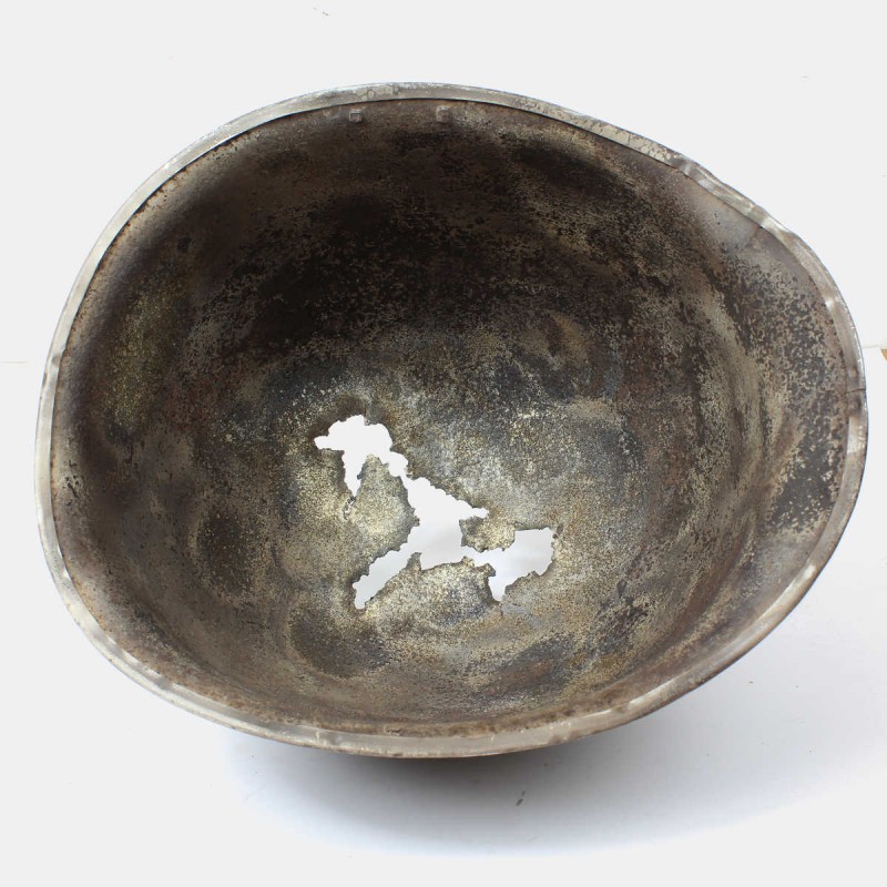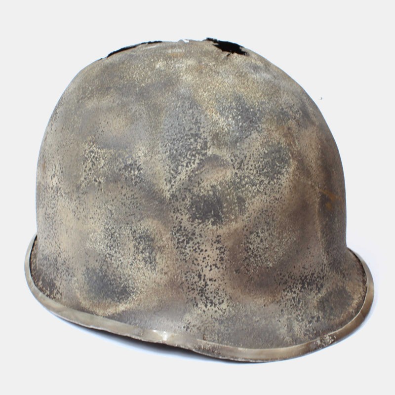 Cette coque de casque américain M2 est originale. Ce type de casque était utilisé par les parachutistes américains durant la Seconde Guerre mondiale. Elle porte les stigmates du champ de bataille. A présenter dans une vitrine de reliques des combats. Des trous et l'empattement entre les deux soudures des pontets demi-lune en acier permet de déterminer qu'il s'agit bien d'un modèle M2. Provenance locale.
