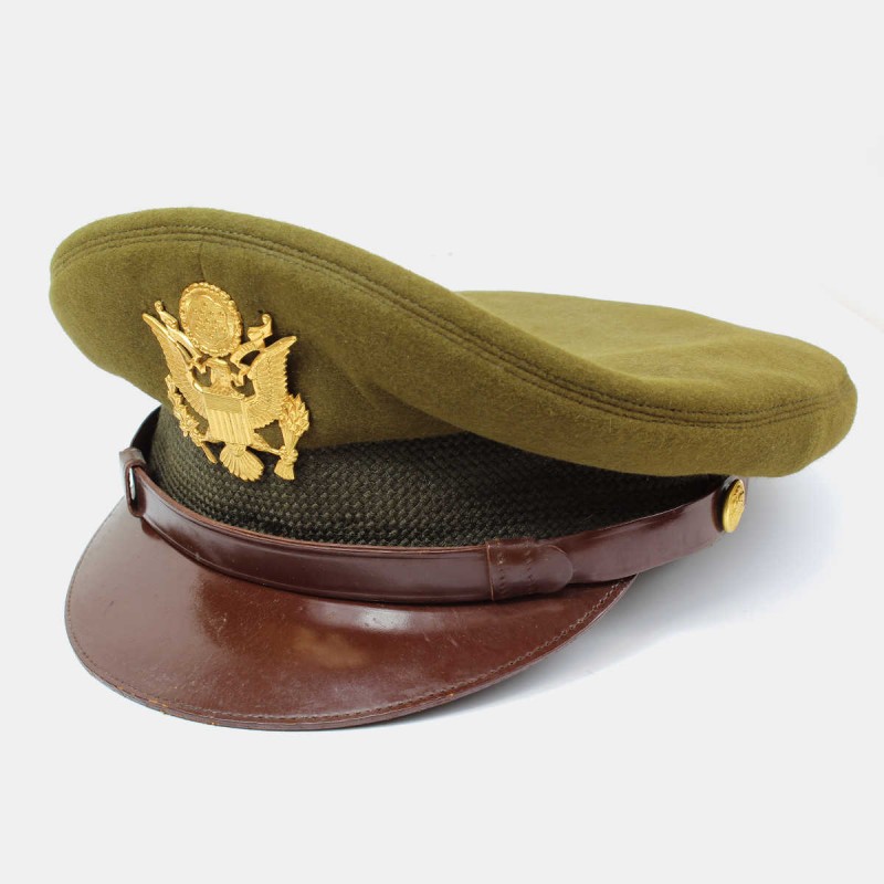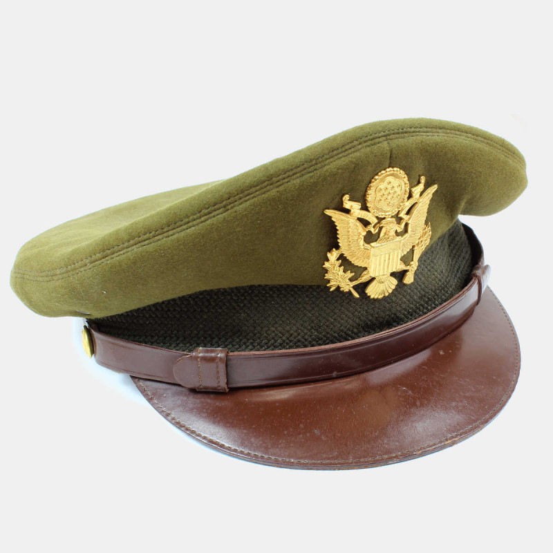 Cette coiffe est originale. Il s'agit de la casquette des officiers de l'armée américaine portée lors de la Seconde Guerre mondiale (USAAF comprises). L'insigne en métal est fourni. Cette casquette est en bon état général. Taille 7 1/8.