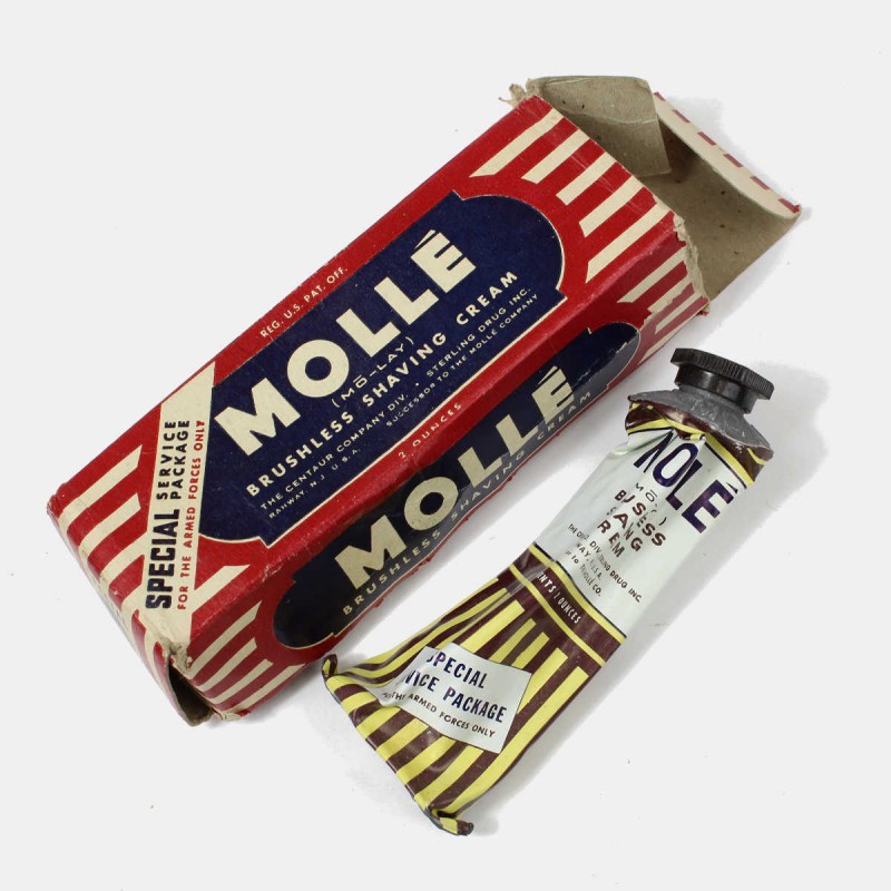 Cet article est original. Il s'agit de l'un des nombreux modèles de crèmes à raser distribués aux soldats de l'armée américaine durant la Seconde Guerre mondiale. La marque est Molle et l'ensemble comprend le tube ainsi que l'emballage en carton. Cet ensemble montre des signes d'usure.
